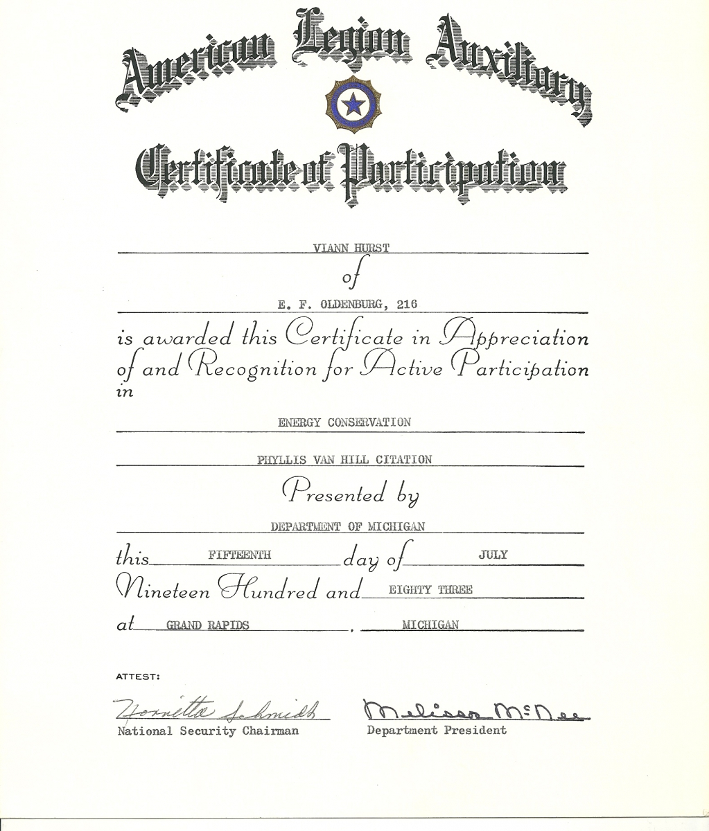 Viann Hurst: Energy Conservation Phyllis Van Hill Citation 1983